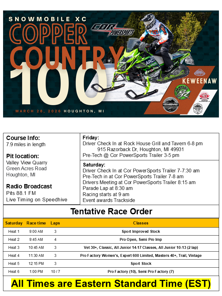 Copper Country 100 race day schedule